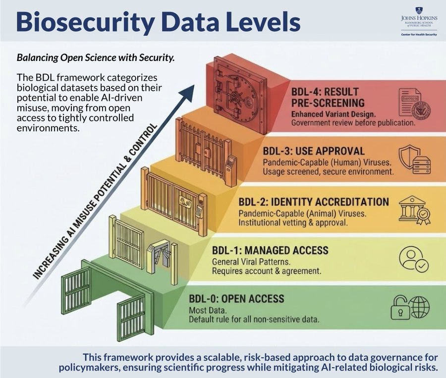 The fantastic Jassi Pannu (who testified to Congress in December) and several other big names in AI-for-biology wrote a paper published this week in Science proposing a “Biosecurity Data Level” (BDL) framework to govern access to pathogen data that could be misused by AI models. Overall, the thinking is very to the NTI framework for managing access to biological AI discussed in last week’s newsletter. The Science paper focuses more on training data, controlling access to a narrow band of new, sensitive pathogen data can meaningfully reduce misuse risk without hampering the vast majority of scientific research.